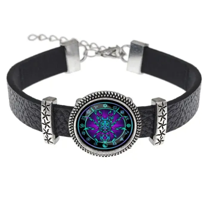 Кожаный браслет с декоративным элементом в виде паука под стеклянной линзой.