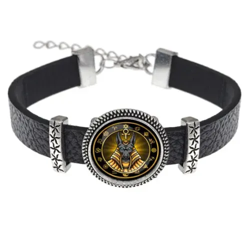 Кожаный браслет с изображением Анубиса. Дизайн защищен выпуклой стеклянной линзой.