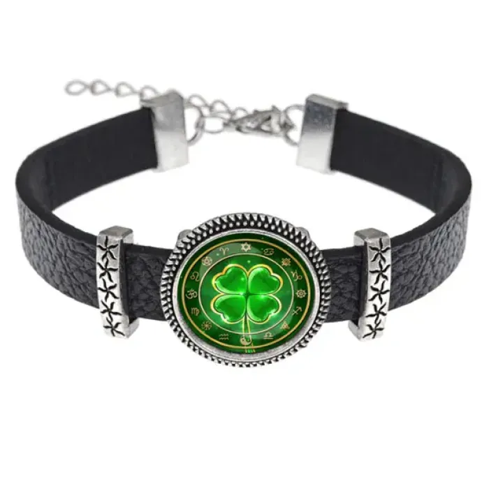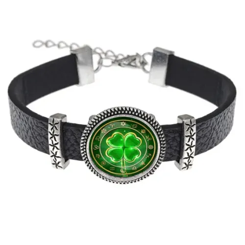 Кожаный браслет с декоративным элементом в виде клевера под стеклянной линзой.