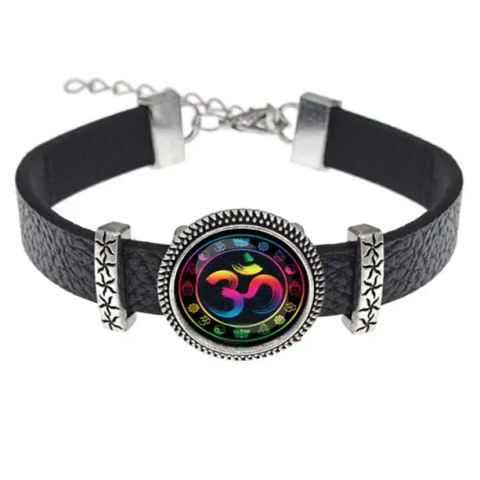 Кожаный браслет с символом Ом. Изготовлен из кожи, металла и стекла. Декоративный элемент — изображение под выпуклой стеклянной линзой диаметром 18 мм.