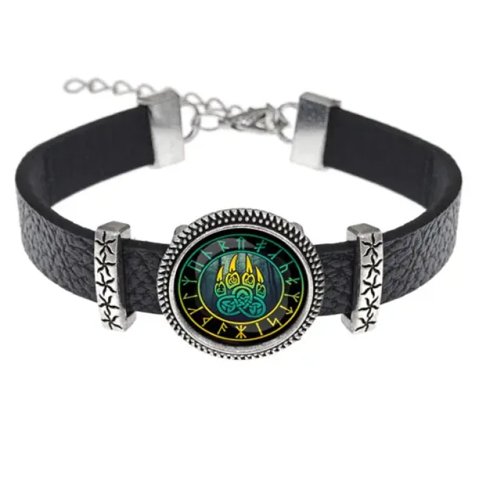 Кожаный браслет с декоративной печатью, изображающей символ Велеса из славянской мифологии.