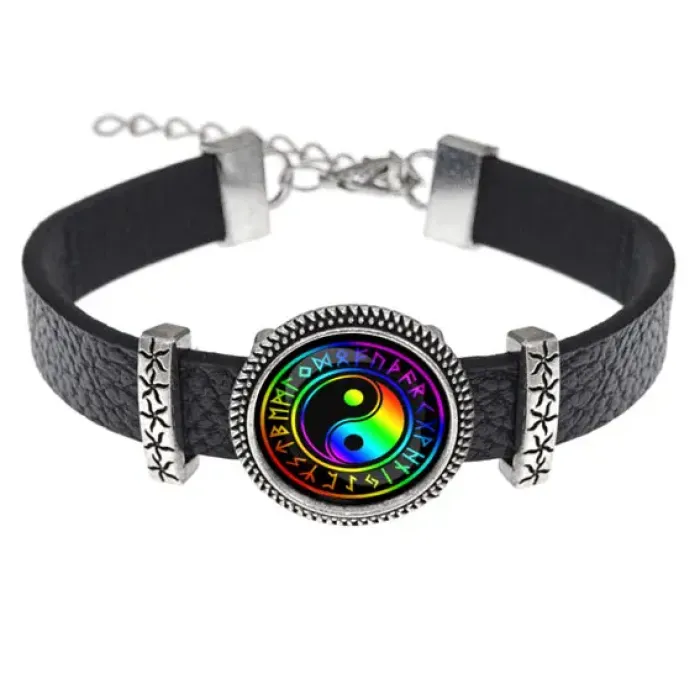 Кожаный браслет с символом Инь-Ян. Изображение расположено под выпуклой стеклянной линзой, размер регулируется.