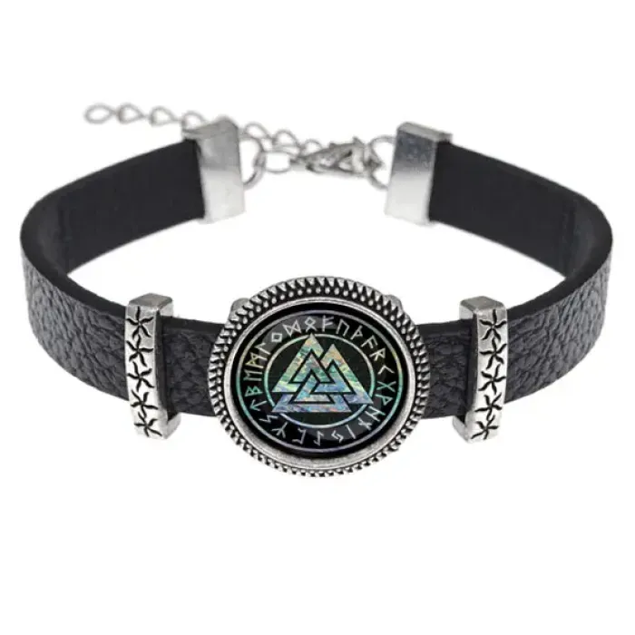 Кожаный браслет с символом валькнута. Изготовлен из кожи, металла и стекла.