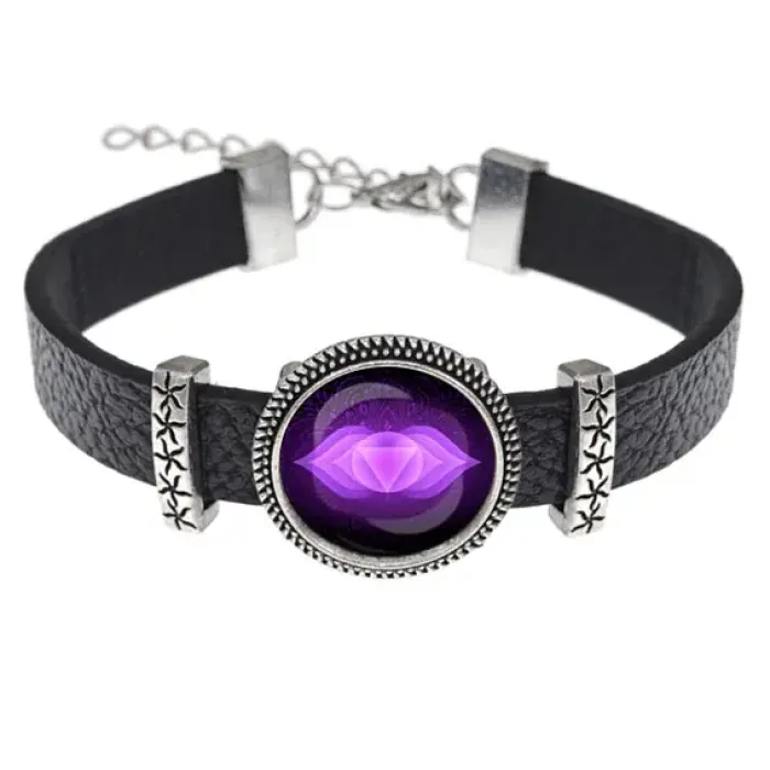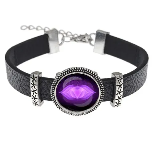 Кожаный браслет с изображением Аджна чакры. Украшение диаметром 18 мм под выпуклой стеклянной линзой.