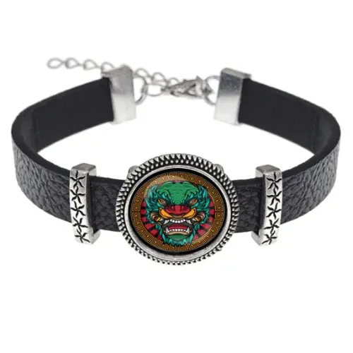 Кожаный браслет с декоративным элементом в виде дракона под стеклянной линзой.