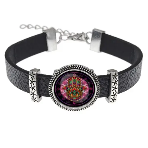 Кожаный браслет с символом Хамса. Изображение под выпуклой стеклянной линзой, регулируемый размер.