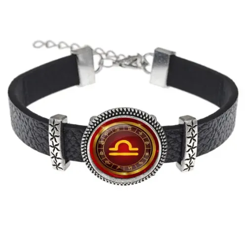 Кожаный браслет с изображением знака зодиака Весы станет стильным аксессуаром и символом гармонии. Этот уникальный предмет выполнен из качественной кожи, металла и стекла, что обеспечивает долговечность и привлекательный внешний вид.