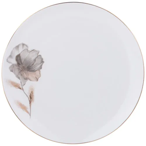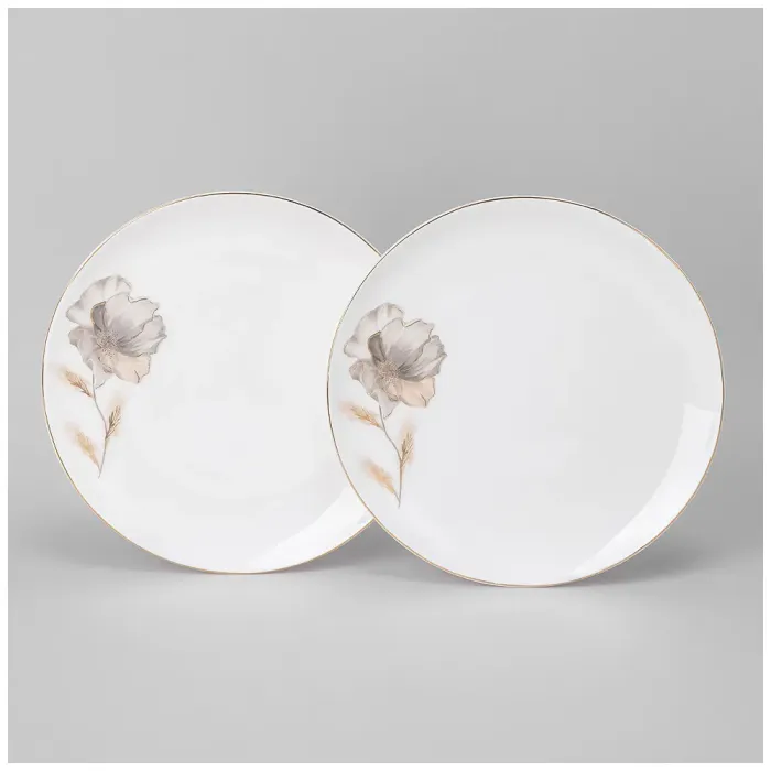 Тарелки изготовлены из костяного фарфора, что обеспечивает им высокую прочность при тонких стенках и характерный молочный оттенок. Поверхность изделий гладкая. Внешний вид дополнен декоративным рисунком с золотым цветочным узором и окантовкой.