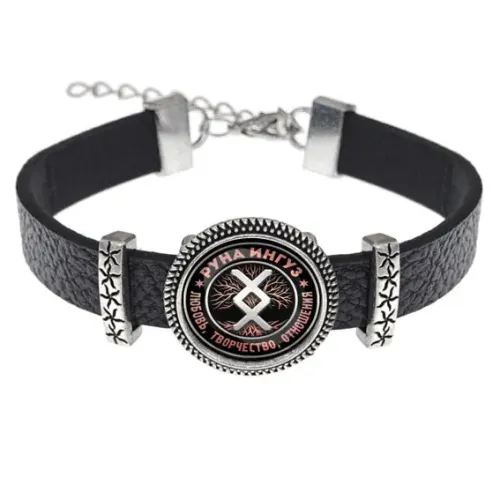 Кожаный браслет с металлической вставкой и изображением руны Ингуз под стеклянной линзой.