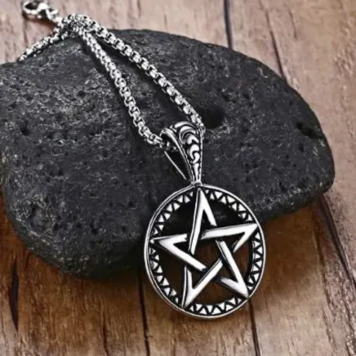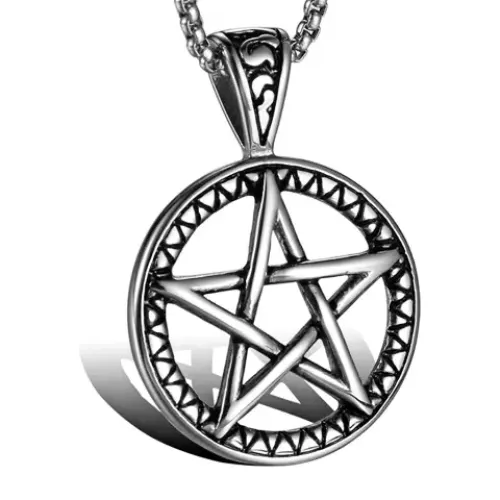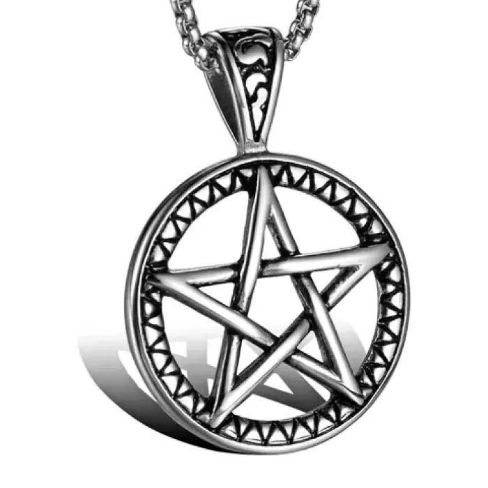 Сувенирный амулет в виде пентаграммы на цепочке. Материал — бижутерный сплав с покрытием под серебро.