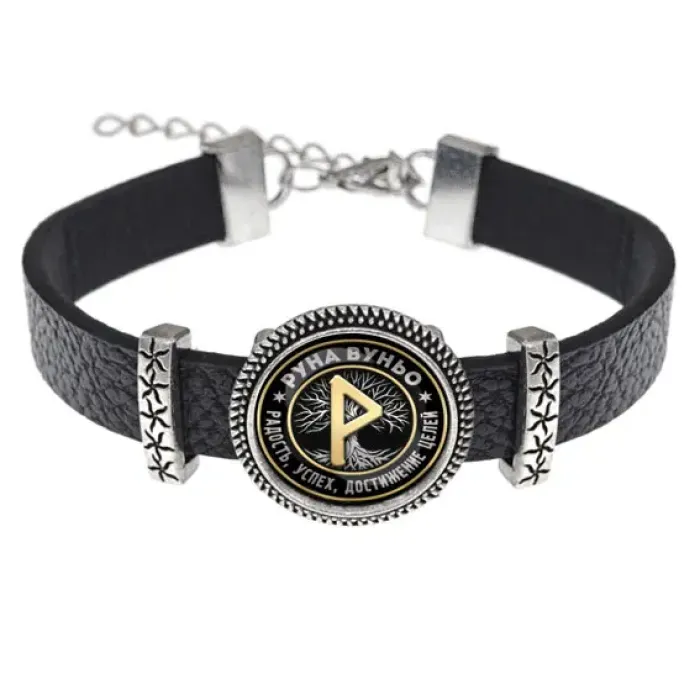 Кожаный браслет с металлической вставкой. Изображение руны Вуньо диаметром 18 мм расположено под выпуклой стеклянной линзой.