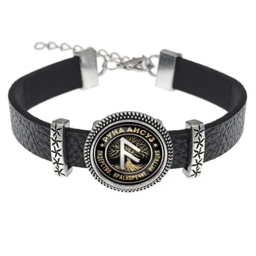 Кожаный браслет с металлической подвеской в виде руны Ансуз. Изображение руны диаметром 18 мм расположено под выпуклой стеклянной линзой.