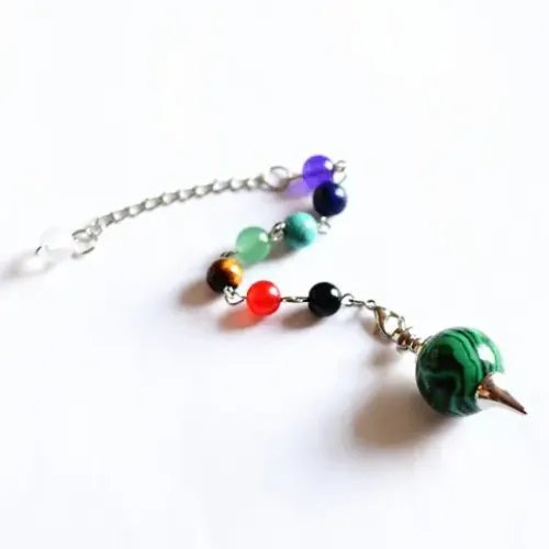 Большой маятник для биолокации из синтетического малахита с цепочкой, украшенной цветными бусинами.