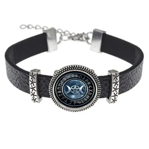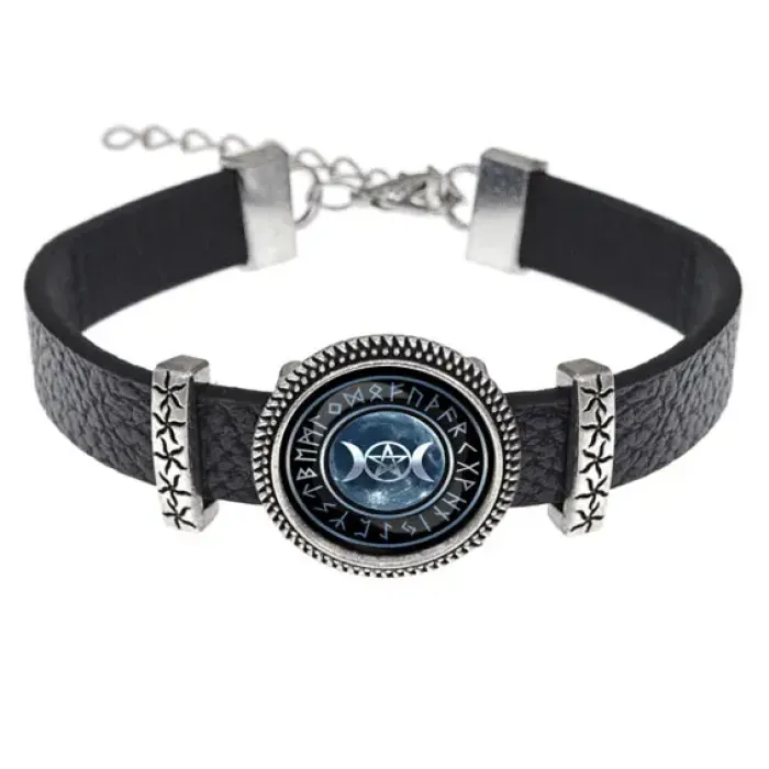 Кожаный браслет с металлическим кулоном и стеклянной линзой. Изображение знака богини диаметром 18 мм.