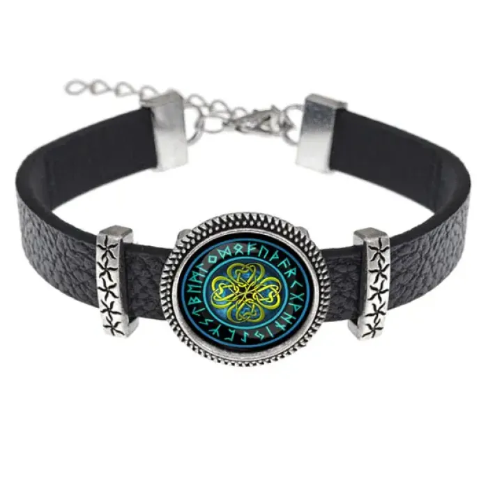Кожаный браслет с изображением клеверного листа. Изделие дополнено металлическими элементами и стеклянной линзой.