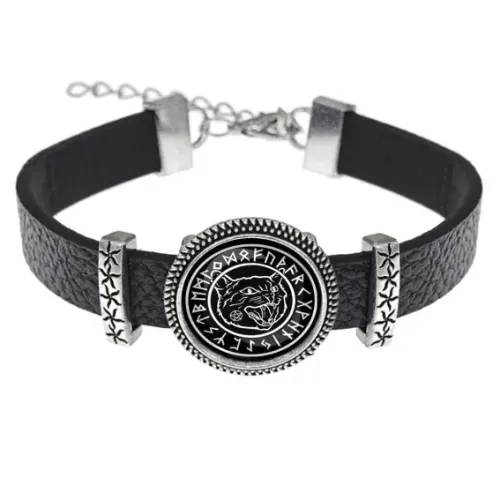 Кожаный браслет с декоративным элементом в виде черного кота. Изображение защищено выпуклой стеклянной линзой.