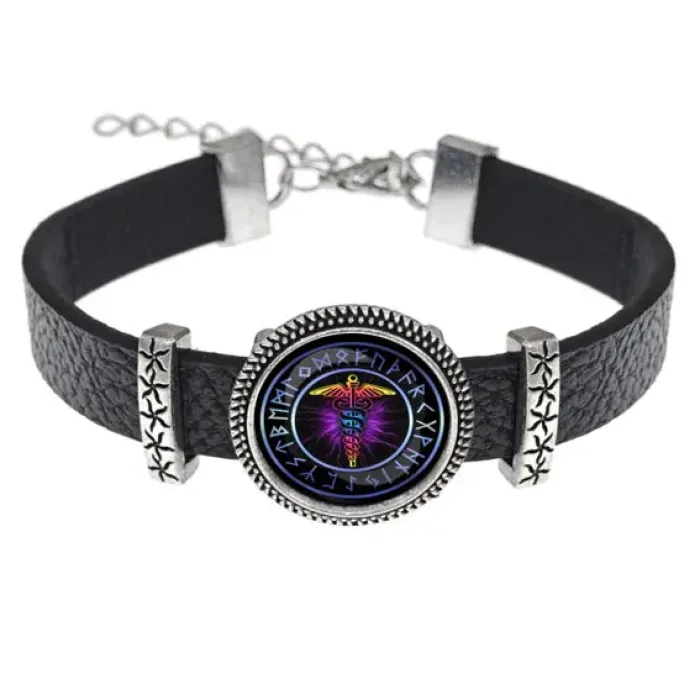 Кожаный браслет с декоративным элементом в виде символа кадуцей. Изображение защищено выпуклой стеклянной линзой.
