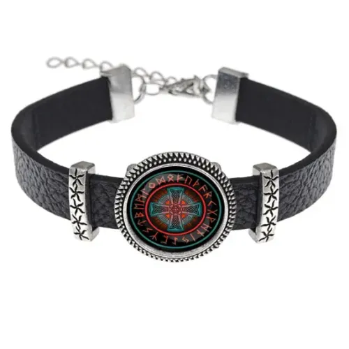 Кожаный браслет с изображением кельтского креста. Изображение диаметром 18 мм расположено под выпуклой стеклянной линзой.