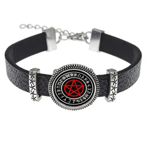 Кожаный браслет с металлической вставкой в виде пентаграммы под выпуклой стеклянной линзой.
