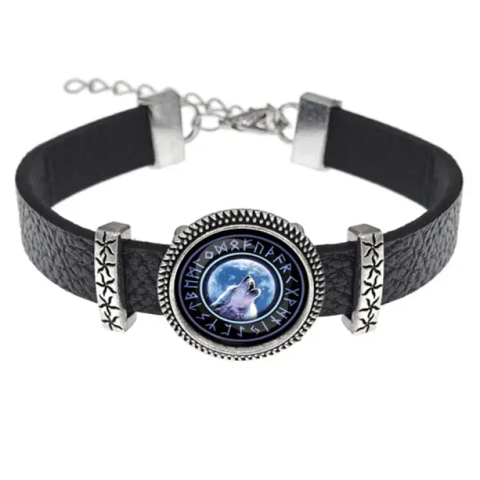 Кожаный браслет с декоративным элементом в виде волка. Изображение защищено выпуклой стеклянной линзой.
