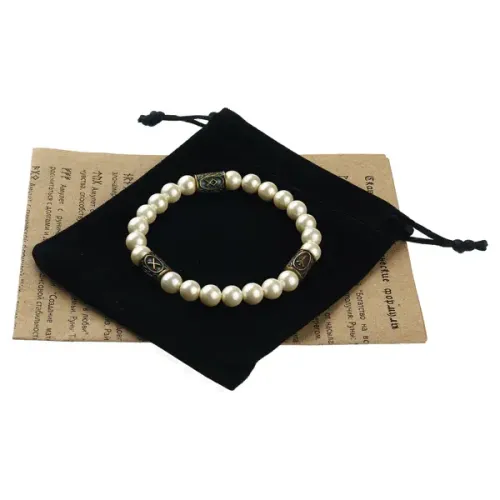 Размеры и комплектация: Диаметр бусин жемчуга 8 мм, размер латунных бусин 12х7 мм. Комплектуется бархатным мешочком и буклетом с описанием рунических формул.