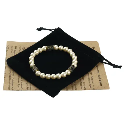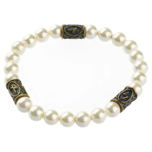 Рунический браслет из искусственного жемчуга майорка, украшенный латунными бусинами с рунической формулой.