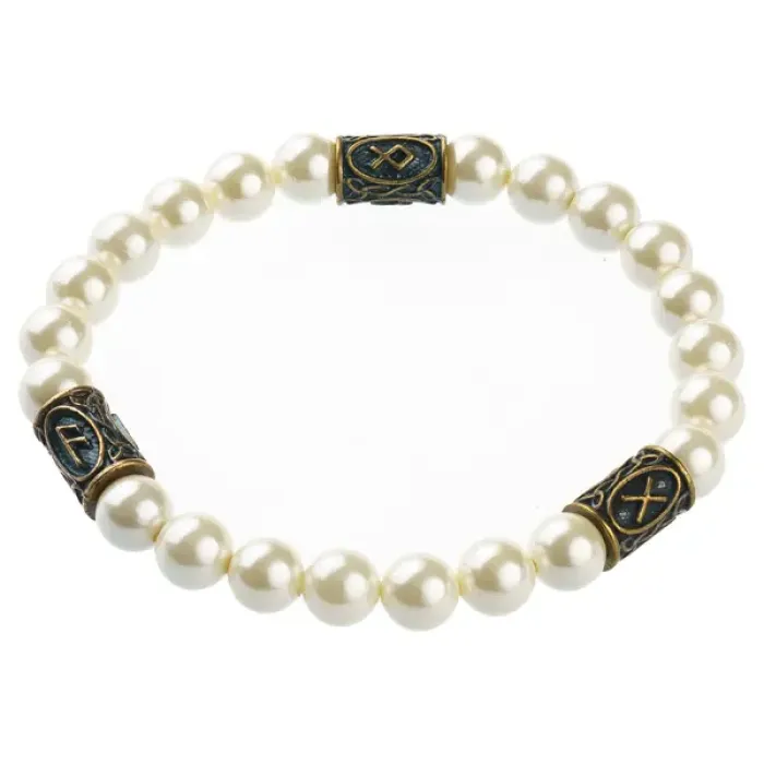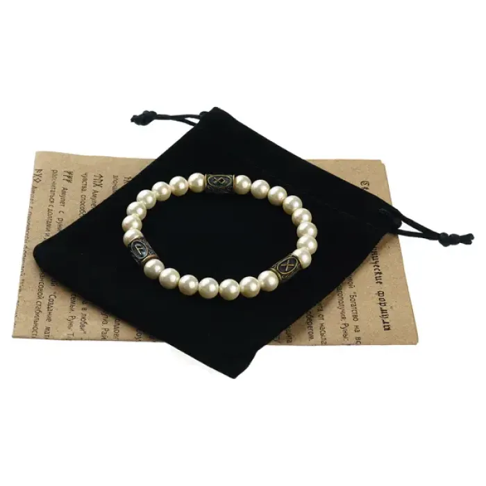 Рунический браслет Укрепление семьи — это стильный стрейч-браслет из майорки, выполненный из высококачественного искусственного жемчуга. Он украшен рунической формулой из латунных бусин, что придаёт изделию уникальный смысл и символику.