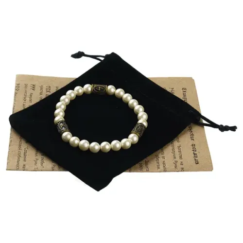 Рунический браслет из искусственного жемчуга (майорка) и латуни с нанесёнными руническими символами.