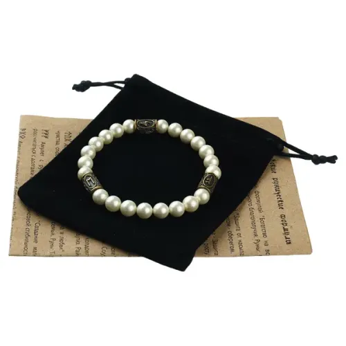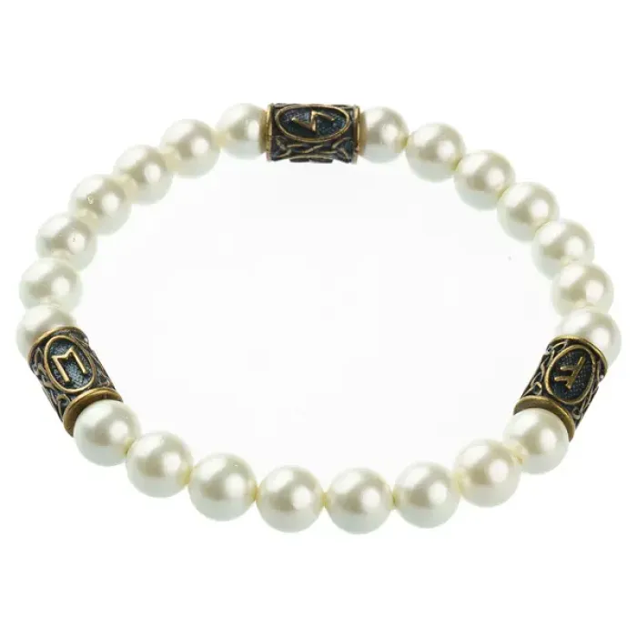 Рунический браслет из искусственного жемчуга (майорка) с латунными бусинами, образующими руническую формулу.