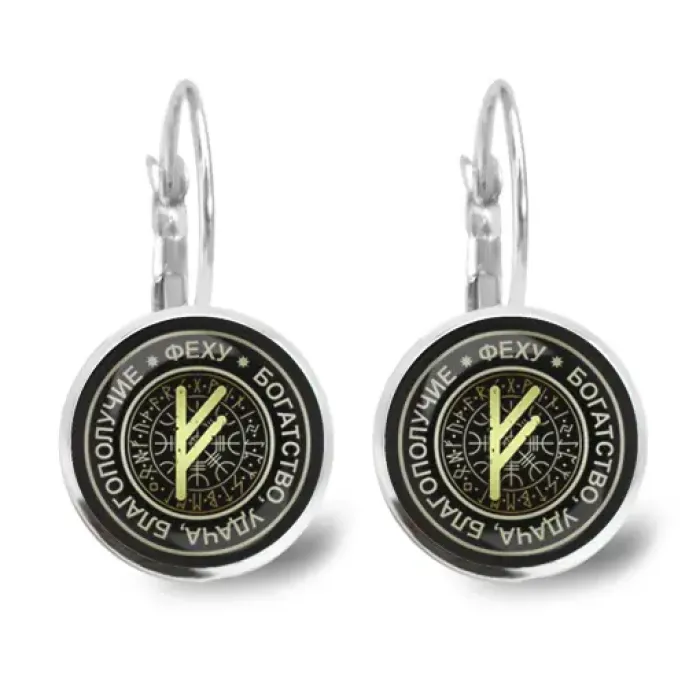 Серьги с изображением руны Феху. Изготовлены из бижутерного сплава, украшены выпуклыми стеклянными линзами.