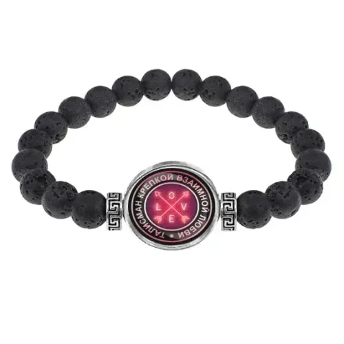 Стрейч-браслет из натуральной лавы диаметром 8 мм — это не только стильный аксессуар, но и символ крепкой взаимной любви. Лава, известная своей силой и мужеством, традиционно используется для достижения целей и исполнения желаний. Браслет украшен изображением под выпуклой стеклянной линзой диаметром 20 мм, что придаёт ему особую выразительность.