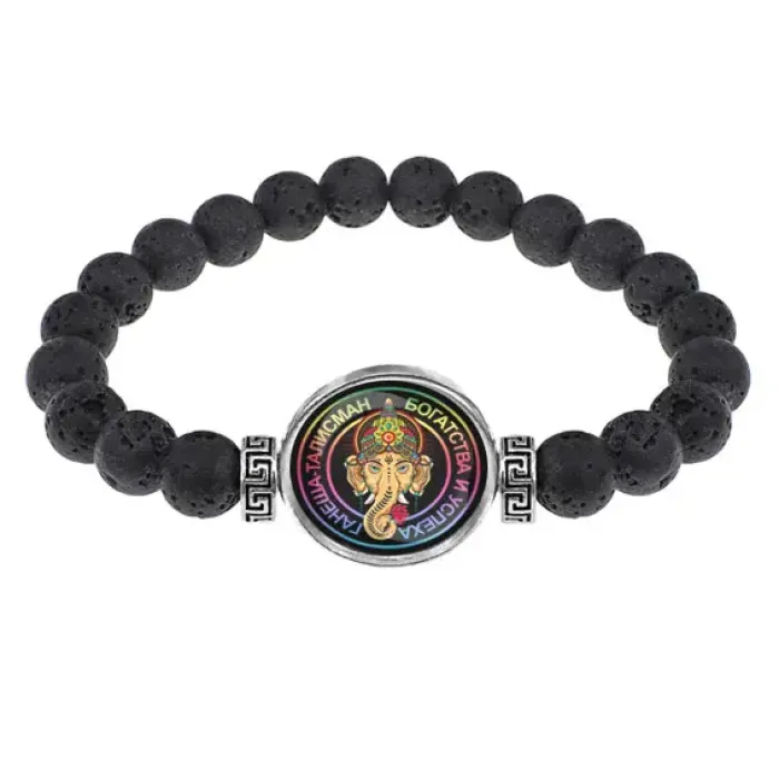 Стрейч-браслет из натуральной лавы диаметром 8 мм с изображением Ганеши под выпуклой стеклянной линзой.