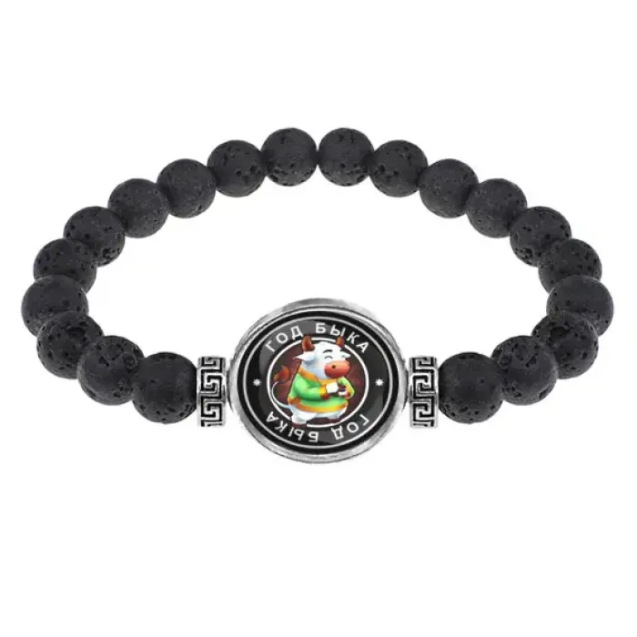Стрейч-браслет из натуральной лавы диаметром 8 мм — это не просто украшение, а символ силы и мудрости. Изображение знака года Быка под выпуклой стеклянной линзой добавляет уникальности и глубины этому аксессуару.