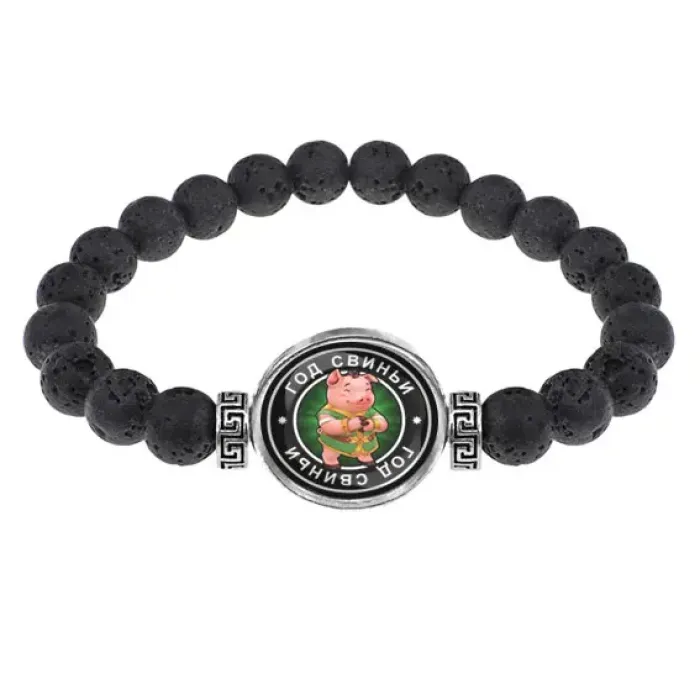 Стрейч-браслет из натуральной лавы диаметром 8 мм — это не просто аксессуар, а символ силы и мудрости. С изображением знака года Свиньи, он наполнен глубоким культурным смыслом восточного гороскопа. Браслет украшен стеклянной линзой диаметром 20 мм, что придаёт ему уникальный вид.