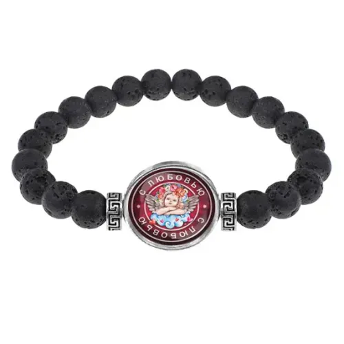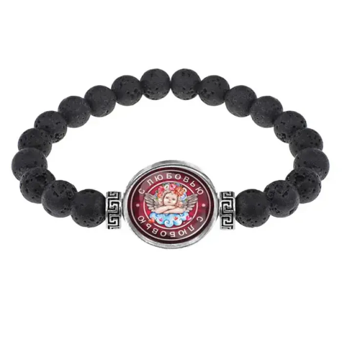 Стрейч-браслет из натуральной лавы диаметром 8 мм с изображением под выпуклой стеклянной линзой. Этот уникальный аксессуар не только стильный, но и символизирует силу, мужество и мудрость. Внутренний диаметр составляет примерно 5,5 см, что делает его удобным для ношения. Материалы: лава, бижутерный сплав с покрытием под серебро и стекло. Браслет также отлично подходит для аромабижутерии — достаточно нанести несколько капель эфирного масла на бусины, чтобы создать собственную композицию ароматов. Упаковка выполнена в виде прозрачного пакета.