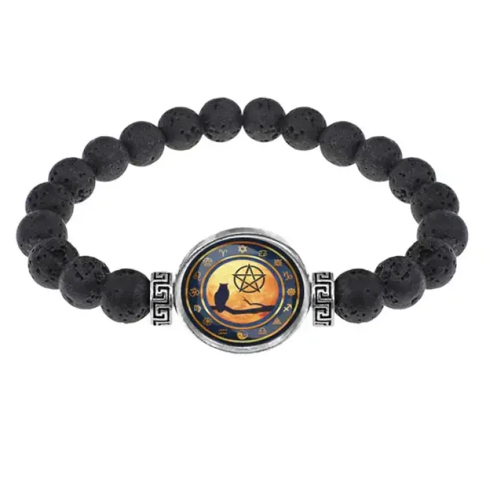 Стрейч-браслет из натуральной лавы диаметром 8 мм с изображением совы и пентаграммы под выпуклой стеклянной линзой.