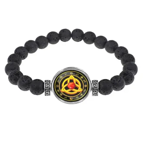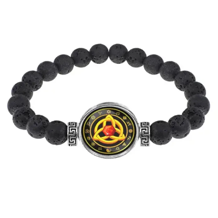 Стрейч-браслет из натуральной лавы диаметром 8 мм с изображением трикветра под выпуклой стеклянной линзой.