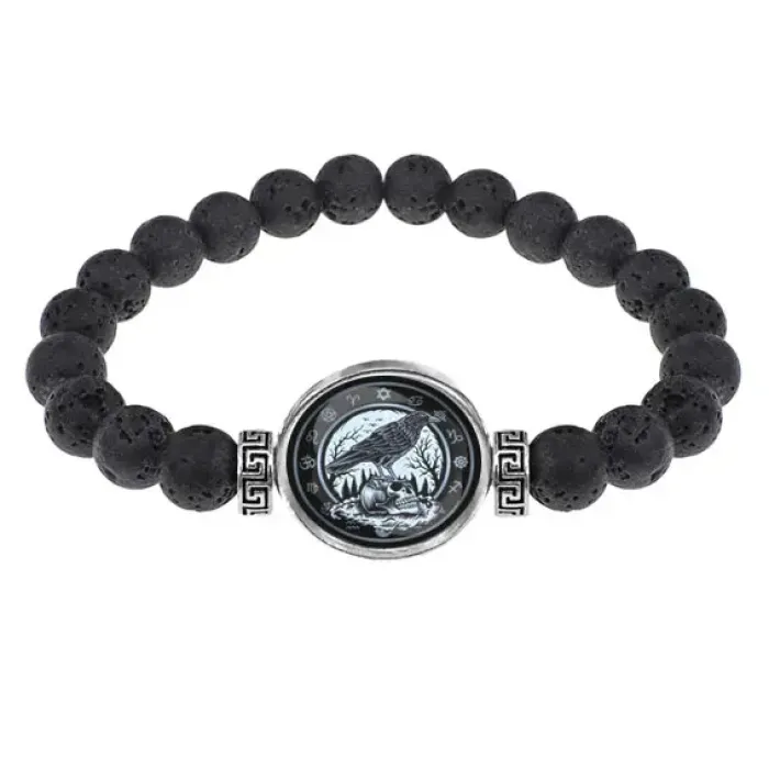 Стрейч-браслет из натуральной лавы диаметром 8 мм с изображением ворона на черепе, защищенным выпуклой стеклянной линзой.
