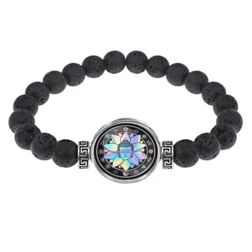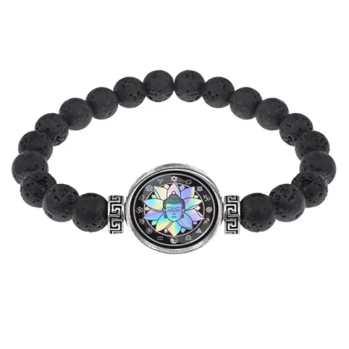Стрейч-браслет из натуральной лавы диаметром 8 мм с изображением Будды под выпуклой стеклянной линзой.
