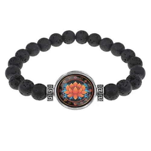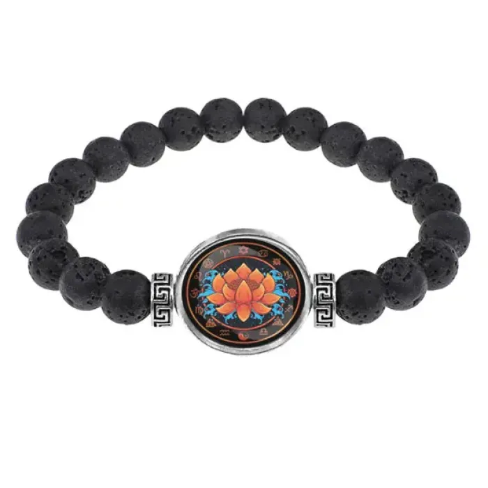 Стрейч-браслет из натуральной лавы диаметром 8 мм с изображением лотоса под выпуклой стеклянной линзой.