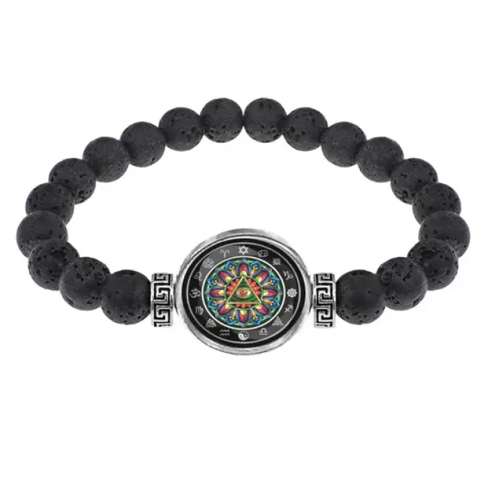 Стрейч-браслет из натуральной лавы диаметром 8 мм с изображением Всевидящего ока, защищенным выпуклой стеклянной линзой.