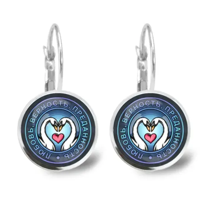 Элегантные серьги с изображением двух лебедей — символа любви и верности. Эти украшения диаметром 18 мм подчеркивают утончённость образа благодаря выпуклым стеклянным линзам, которые придают им особую выразительность. Замок типа левербэк обеспечивает надежную фиксацию, сочетая в себе удобство английской и французской застёжек. Изготовлены из бижутерного сплава с покрытием под серебро и стекла, что делает их идеальным выбором для повседневной носки или особых случаев. Упакованы в прозрачный пакет без подложки, что позволяет сразу оценить красоту изделия.