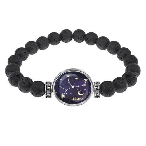 Стрейч-браслет из натуральной лавы диаметром 8 мм с изображением знака зодиака Дева под выпуклой стеклянной линзой. Этот уникальный аксессуар не только стильный, но и наполнен глубоким символизмом, олицетворяющим силу, мужество и интуицию. Внутренний диаметр браслета составляет около 5,5 см, что обеспечивает комфортную посадку на запястье.