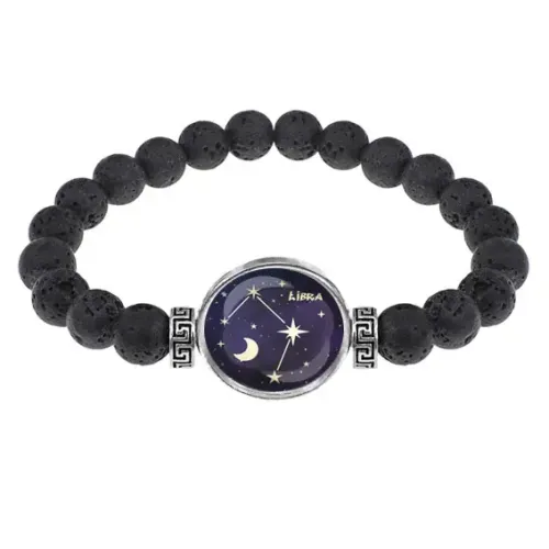Стильный стрейч-браслет из натуральной лавы диаметром 8 мм, украшенный изображением знака зодиака Весы под выпуклой стеклянной линзой. Этот аксессуар не только подчеркнёт индивидуальность, но и наполнит жизнь энергией и позитивом благодаря свойствам камня. Лава символизирует силу, мужество и интуицию, а также помогает в достижении целей и исполнении желаний.