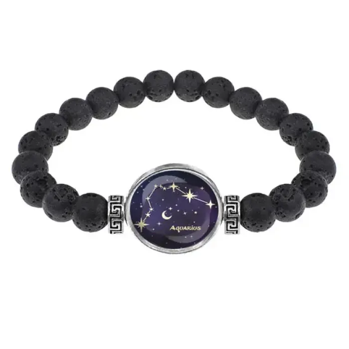 Стрейч-браслет из натуральной лавы диаметром 8 мм — это не только стильный аксессуар, но и символ силы и мудрости. Изображение знака зодиака Водолей под выпуклой стеклянной линзой добавляет индивидуальности, а внутренний диаметр около 5,5 см обеспечивает комфортное ношение.