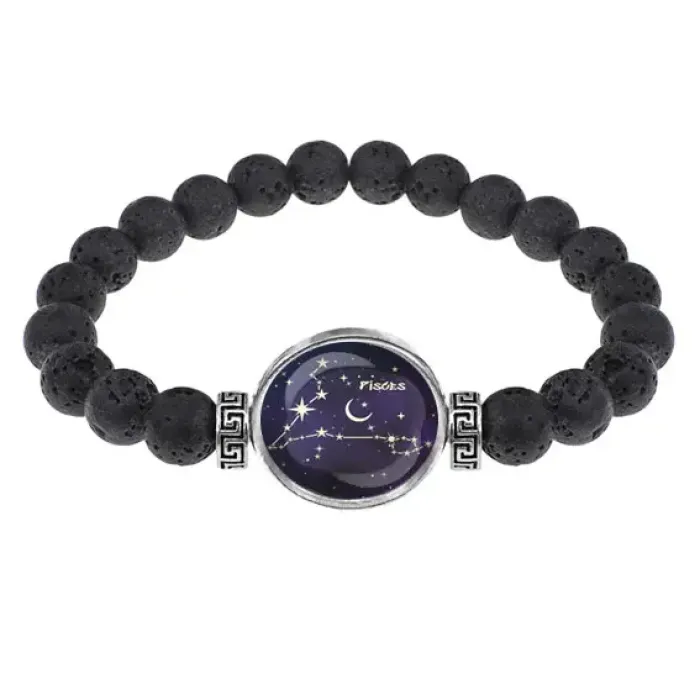Стрейч-браслет из натуральной лавы диаметром 8 мм с изображением знака зодиака Рыбы, защищенным выпуклой стеклянной линзой. Этот стильный аксессуар не только подчеркивает индивидуальность, но и обладает глубоким символическим значением. Лава считается камнем силы и мудрости, традиционно используемым для защиты от негативной энергии и плохого настроения.
