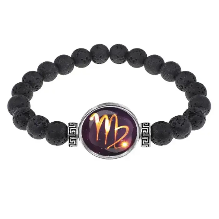 Стрейч-браслет из натуральной лавы диаметром 8 мм с изображением знака зодиака Дева под выпуклой стеклянной линзой. Этот уникальный аксессуар не только стильно дополняет образ, но и символизирует силу, мужество и интуицию. Браслет обладает внутренним диаметром около 5,5 см и выполнен из качественных материалов: лавы, бижутерного сплава с покрытием под серебро и стекла.