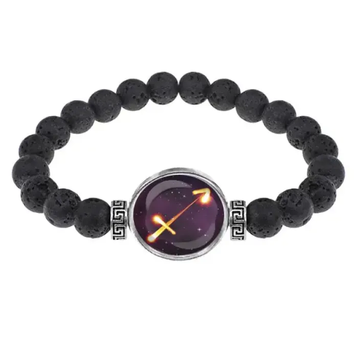 Стрейч-браслет из натуральной лавы диаметром 8 мм с изображением знака зодиака Стрелец, заключённым под выпуклой стеклянной линзой. Этот уникальный аксессуар не только стильный, но и символичный — он олицетворяет силу, мужество и интуицию. Основные характеристики: внутренний диаметр ~ 5,5 см, материал — лава и бижутерный сплав с покрытием под серебро. Браслет упакован в прозрачный пакет.