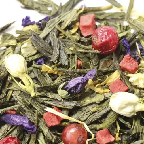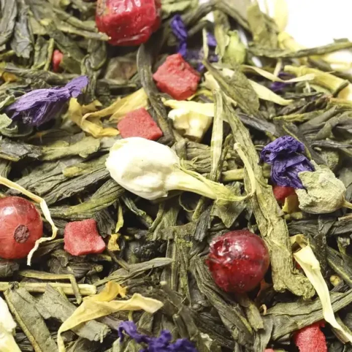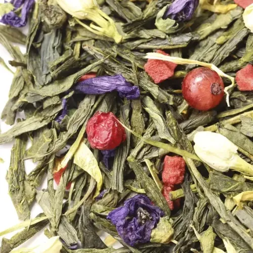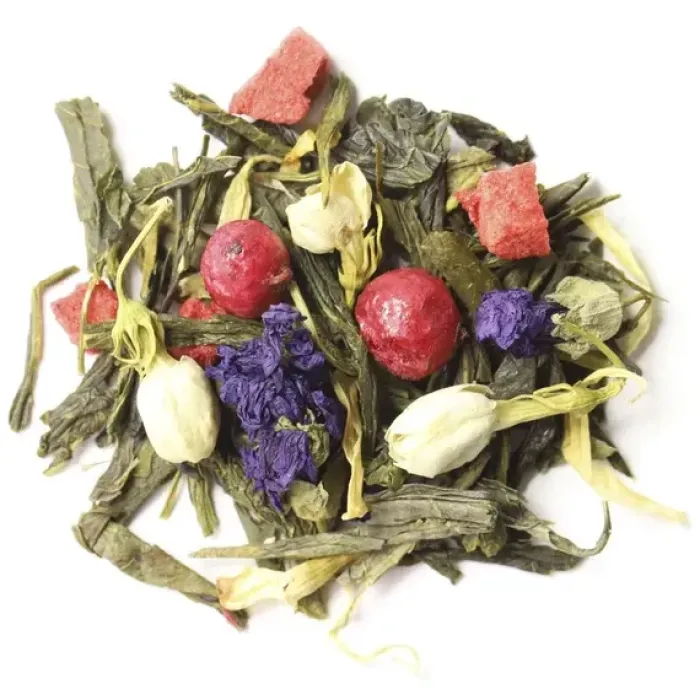 Состав: зелёный китайский чай сенча, кусочки клубники, ягоды красной смородины, бутоны жасмина, цветы мальвы, лепестки календулы, аромат жасмина и клубники.