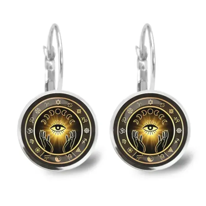 Серьги с изображением глаза и фаз луны. Бижутерный сплав, выпуклые стеклянные линзы, замок типа левербэк.